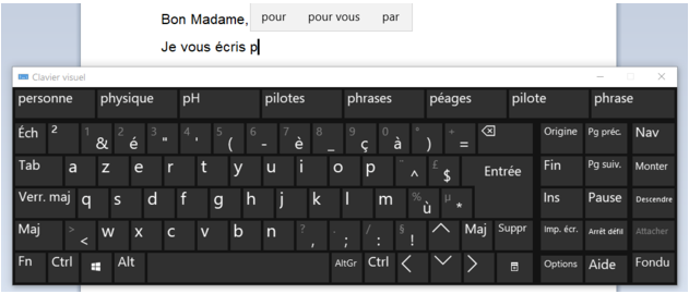 Depuis Windows 10, il est possible d’activer la saisie prédictive, voici la  procédure : Aller dans « Paramètres », puis « Périphériques », sélectionner « Saisie », puis cocher le bouton « Afficher les suggestions de texte pendant la frappe ». La prédiction n’est pas phonétique et fonctionne avec les logiciels de Microsoft (Wordpad, Word, PowerPoint).