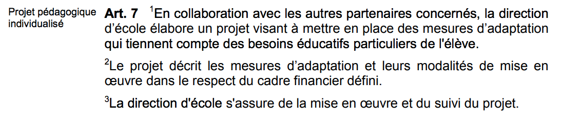 Lorsque les besoins éducatifs particuliers d’un élève sont avérés, des mesures d’adaptation sont mises en oeuvre selon une projet pédagogique individualisé, y compris lors des évaluations.